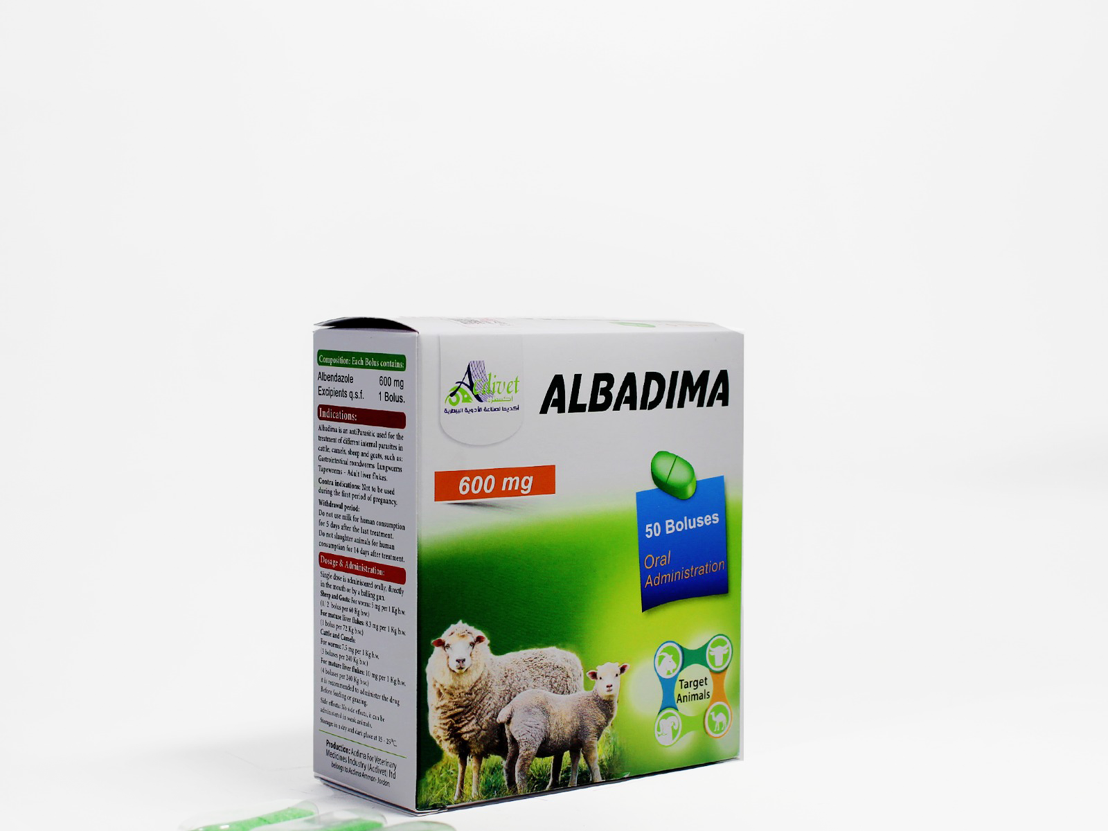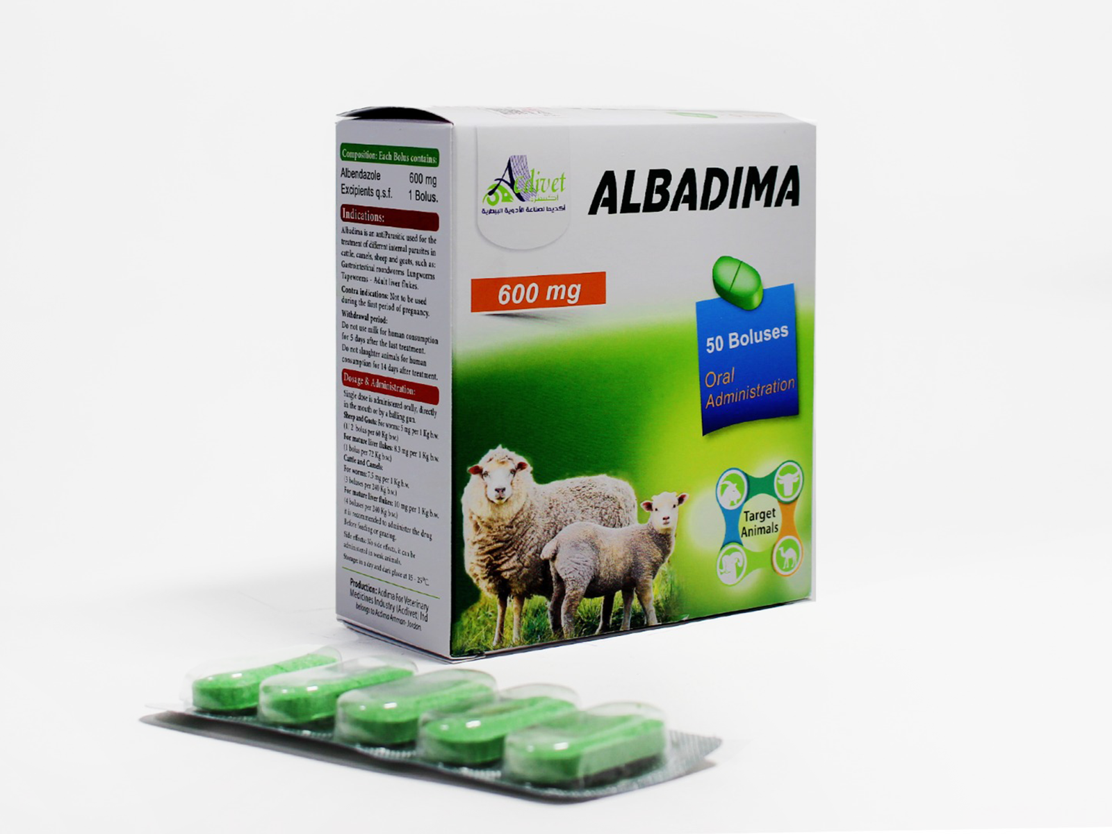 Albadima is an antiparasitic preparation used for the treatment of various internal parasites in cattle, camels, sheep, and goats, including: