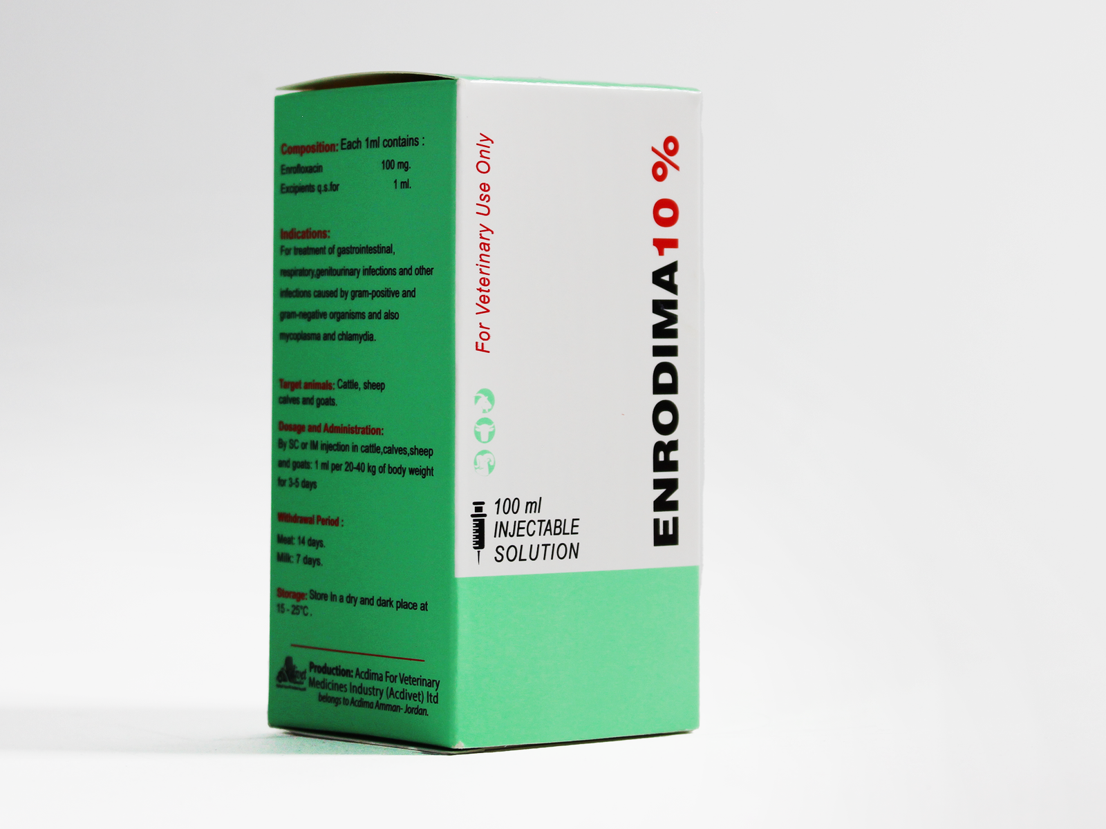 Enrodima is recommended for the treatment of most diseases affecting the respiratory, digestive, and genitourinary systems, including uterine infections, as well as other infections caused by a wide range of gram-positive and gram-negative bacteria, including Salmonella, and Mycoplasma. It can be used in cattle, buffaloes, sheep, goats, dogs, cats, rabbits, poultry, and pigs.