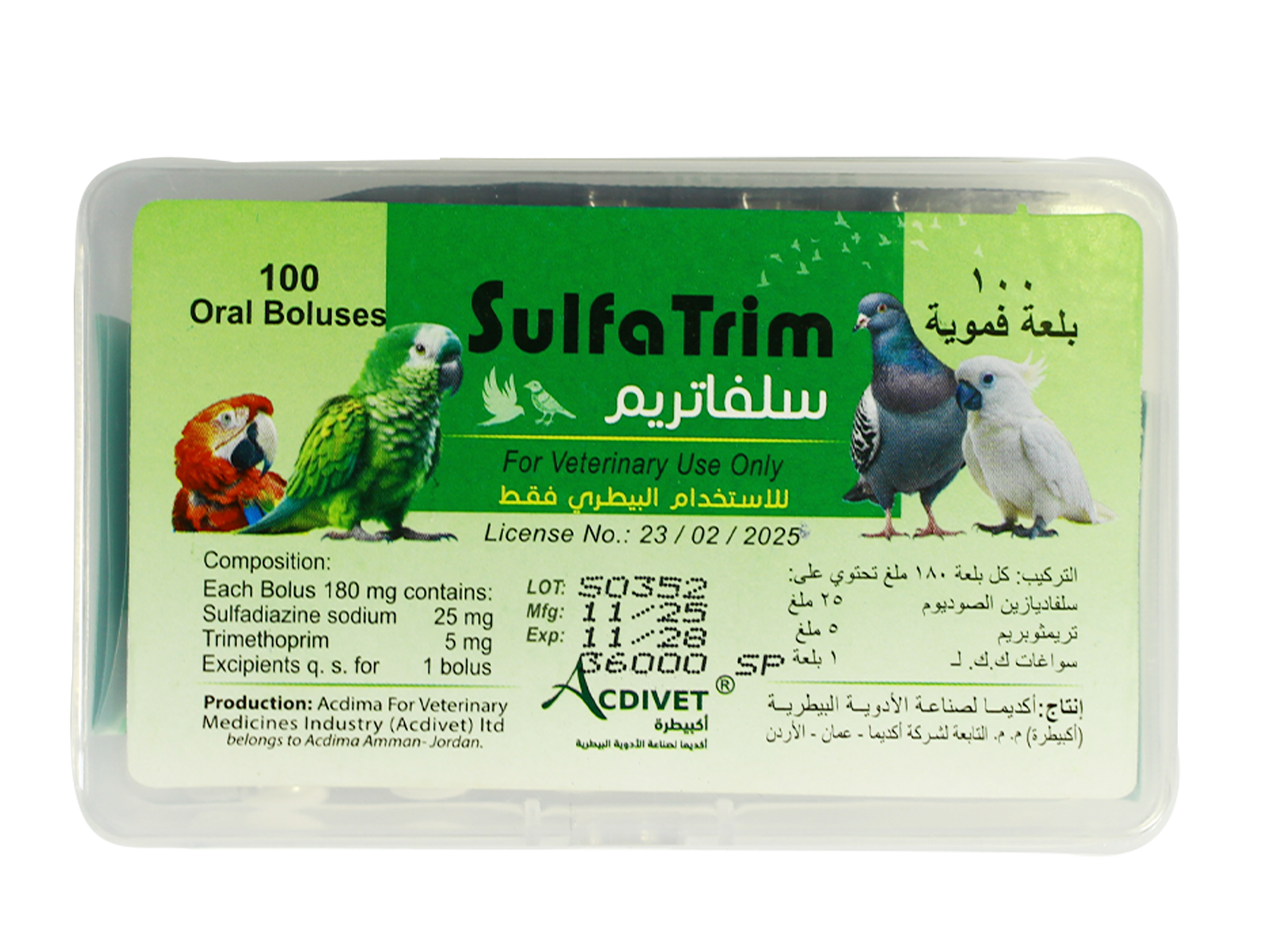Sulfatrim contains sulfadiazine combined with trimethoprim, making it effective in treating gastrointestinal infections, diarrhea, coccidiosis, E. coli, and Salmonella. It can also be used to treat respiratory tract infections as well as genitourinary tract infections in pigeons, parrots, and ornamental birds.
